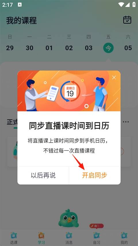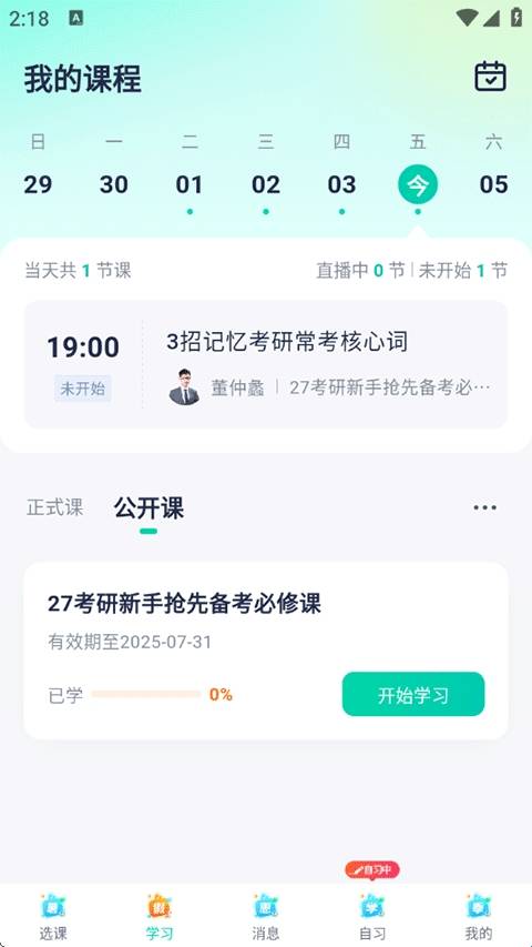 6、已选择学习的课程将会在学习页展示,上方的日历模式也会有提示上课时间;