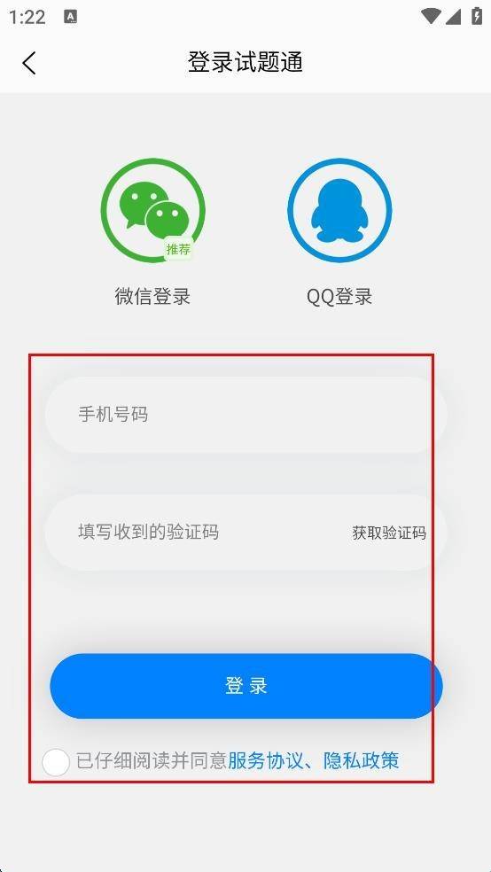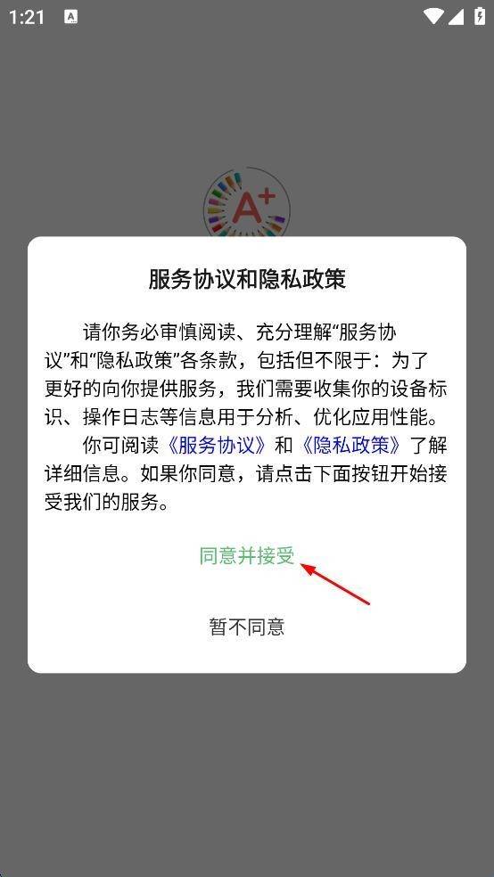 1、打开试题通,弹出服务协议和隐私政策提示,点击同意并接受,进入软件主界面。
