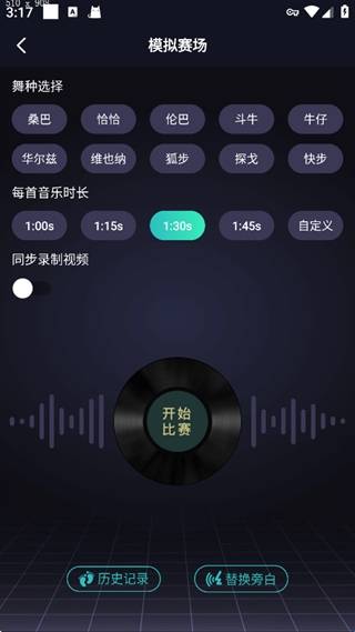 举个例子,如果你想进行拉丁全舞种的模拟与练习,那么就可以将【桑巴】、【恰恰】、【伦巴】、【斗牛】、【牛仔】全部选中(点亮即选中),之后从1min-3min区域中任意选择时长即可。