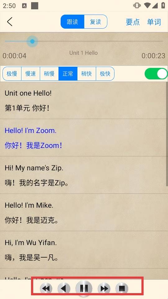 4、利用底部【跟读】【复读】功能,调节语速,跟读模仿对话,提升口语能力。