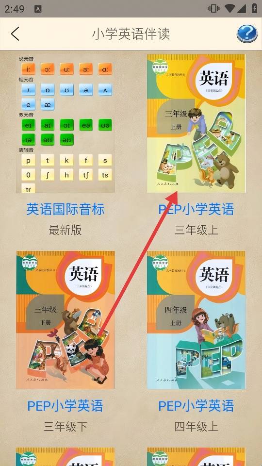 2、在课程列表,选择【PEP小学英语-三年级上】教材,进入该课本学习界面。