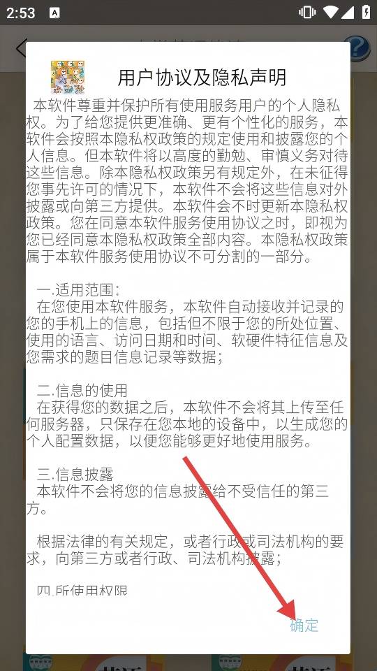 1、弹出【用户协议及隐私声明】后,点击【确定】,同意条款即可进入软件使用。