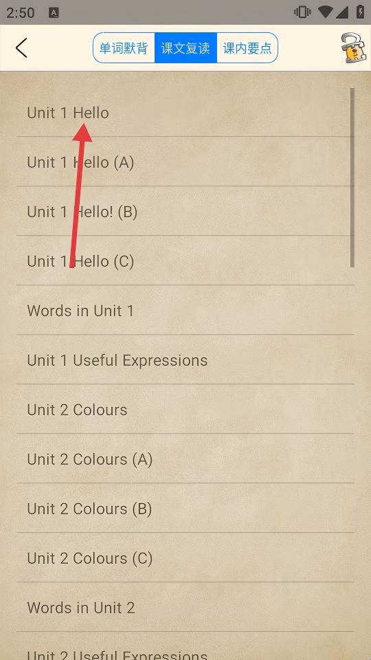 3、切换到【课文复读】,点击【Unit-1-Hello】,进入该单元课文学习页。