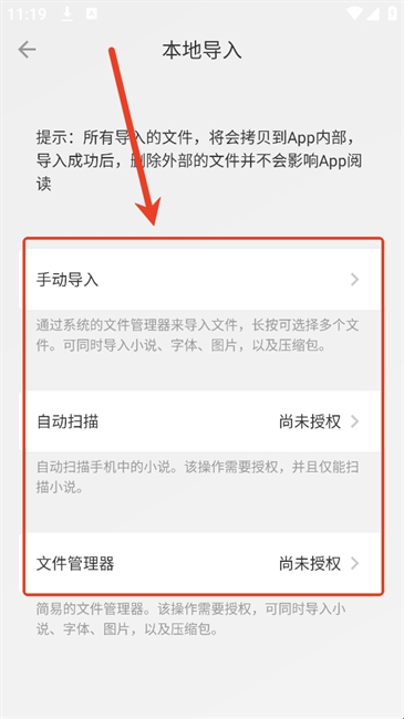 随着安卓版本的更新,以及审核原因,目前Readingo不申请任何权限。因此也无法读取手机中的文件。Readingo的所有操作都在沙盒中进行。