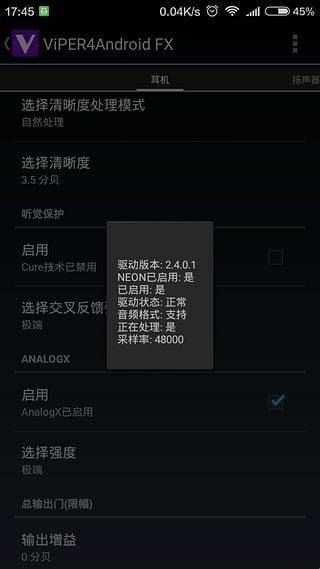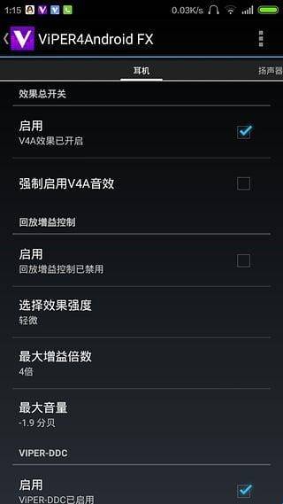 1、效果总开关。该选项定义了是否启用V4A的耳机音效,是总开关。