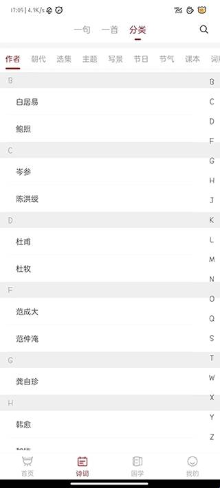 2、诗词界面可以从各种分类来了解,软件也会每天推一句、一首。