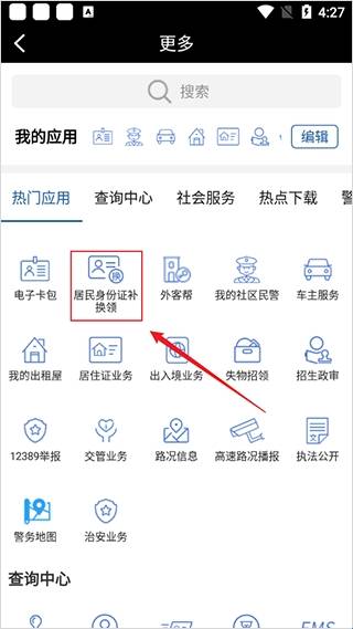 2、找到并进入“居民身份证补换领”功能。