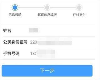 4、系统将自动代入个人身份信息,确认无误后,点击“下一步”,再填写身份证邮寄收取地址。