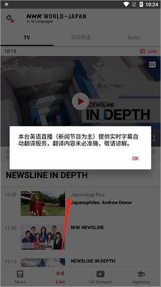 4、在“live”模板中需注意的是本台英文直播新闻节目为主,因此提供的是实时字幕自动翻译服务。