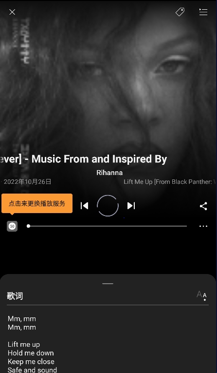 部分歌曲提供自动翻译功能(点击歌词→“翻译”),支持中/英/日韩等12种语言。