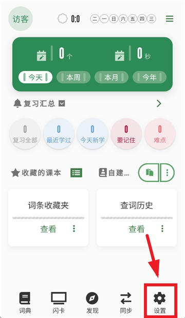 1、下载安装并打开易呗单词app,进入词典首页后点击设置。