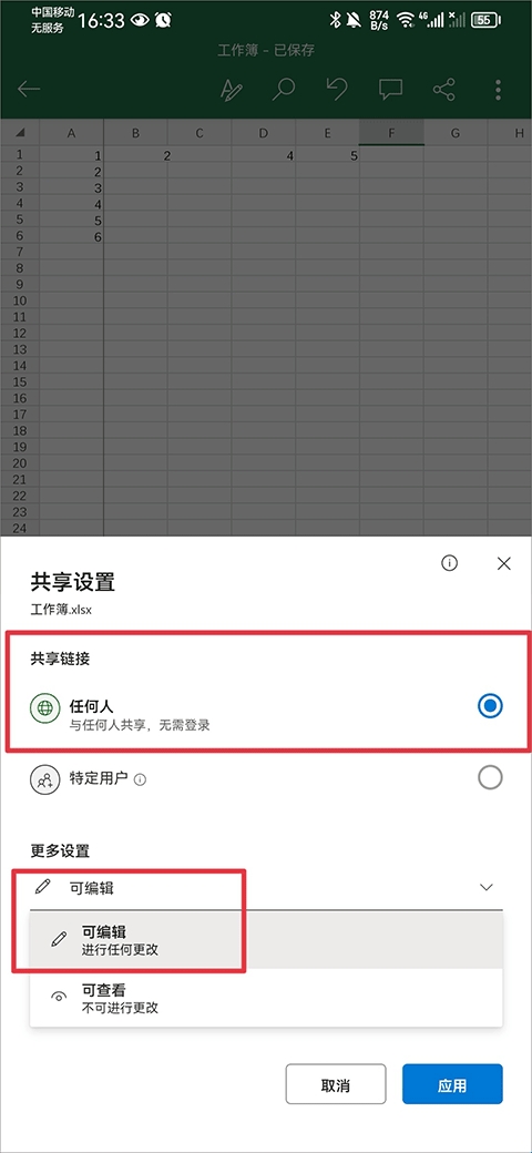 3、然后将权限设置为与任何人共享,可编辑的状态。
