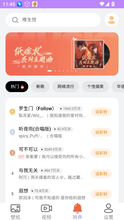 4、铃声页面可根据推荐、分类或直接搜索设置心仪彩铃。