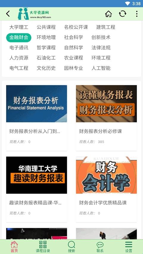 大学课程包括:经济管理、医学课程、市场营销、机械电子、大学理工、公开课程、名校公开课、建筑工程、环境地理、社会科学、创新技术、电子通讯、哲学课程、自然科学、人力资源、石油化工。