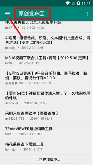 1、在本站下载安装吾爱破解,运行软件,可以看到有原创发布区,如果想看别的板块,点击左上角“三”,就能切换到别的板块;
