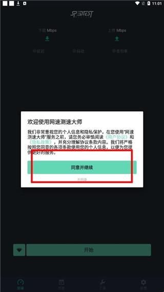 2、第二步,阅读用户协议和隐私政策,并同意网速测试大师继续。