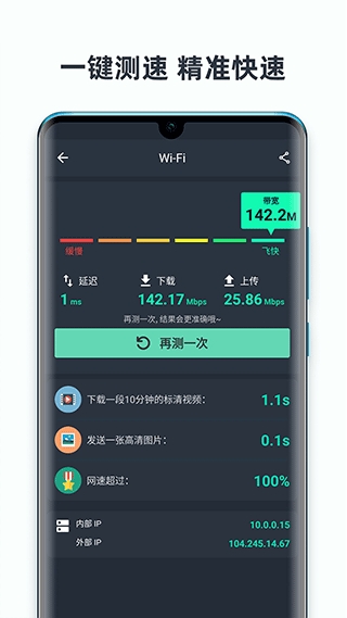 2、准确,智能识别与匹配当前位置的网速测试服务器,测出最精确网速测试结果。