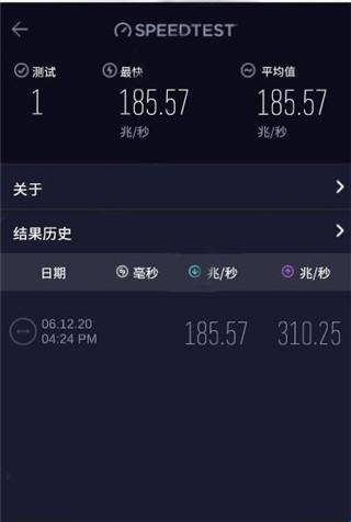 4、点击首页右上角的三条杠,可以看到我们每次测速的结果,测试的时间都有显示,这个还是很方便的。