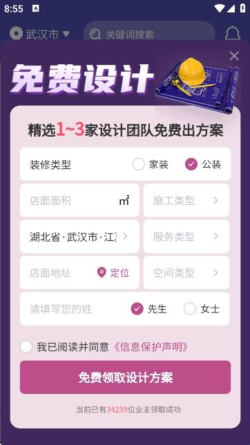 3、若选择业主身份并点击“咨询设计”,可进入免费设计界面,选择装修类型(家装或公装),填写店面面积、施工类型、服务类型、空间类型、个人信息等,勾选同意《信息保护声明》后,点击“免费领取设计方案”,即可获取1~3家设计团队的免费方案。