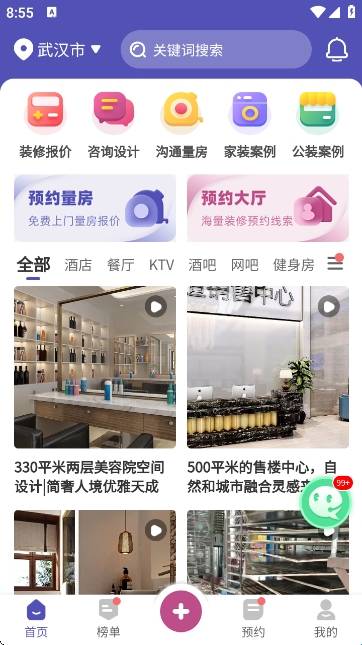 4、进入APP首页,可看到“装修报价”“咨询设计”“沟通量房”“家装案例”“公装案例”等功能入口,下方展示了各类店面设计案例,可点击案例查看详情,也可通过关键词搜索查找特定案例。