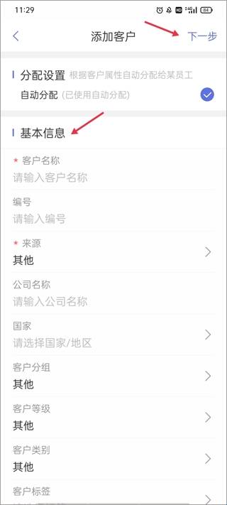 3、填写客户的基础资料以及客户来源,接着点击下一步。