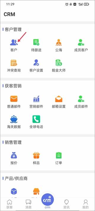 1、输入手机号码和验证码登入程序主界面,切换到中央的"crm"单元,选择客户管理中的客户服务。