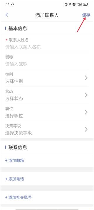 4、最后填写联系人的基础信息以及联络方式,最终点击保存,就完成添加。