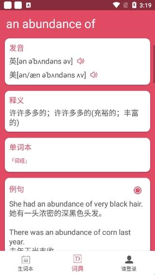 2、每个单词都提供了详细的翻译、例句以及标准读音。