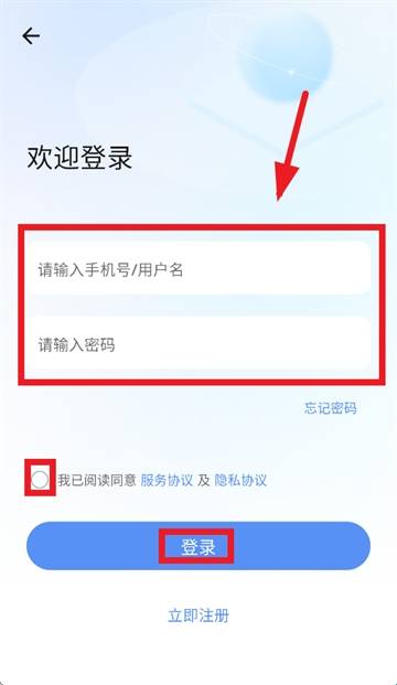 2、跳转至登录界面后,输入手机号/用户名,密码,勾选我已阅读同意服务协议及隐私协议,点击登录即可。