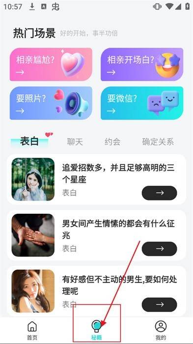 5、如果你对于日常聊天还是非常困扰,可切换到【秘籍】页面,找到各种聊天的小技巧。