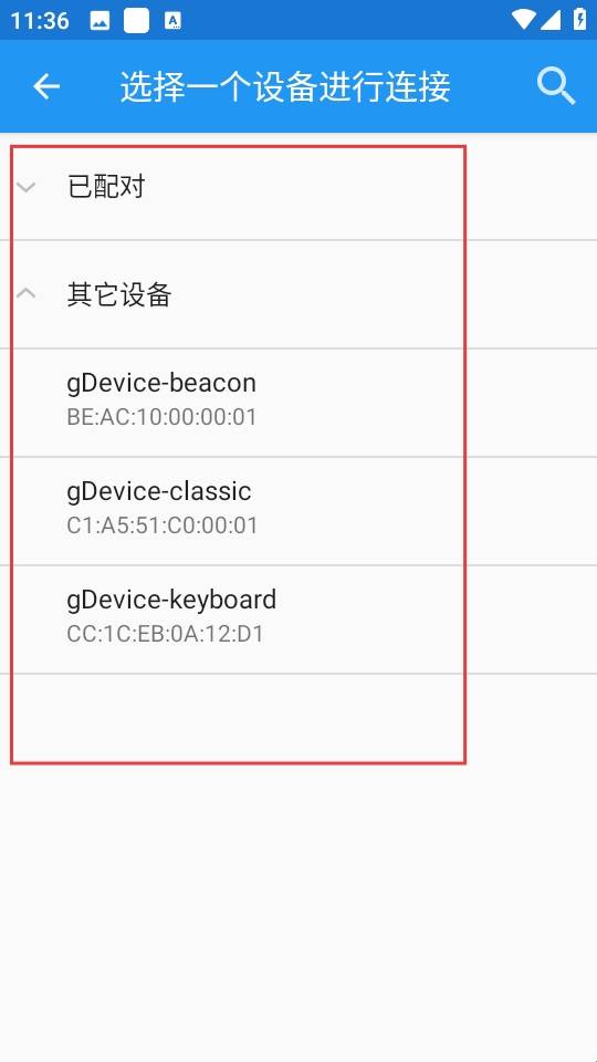 2、设备选择界看到已配对设备和其他设备的列表,已配对设备是之前成功连接过的,其他设备则是周围可检测到的蓝牙设备,在找连接目标点击该设备进行连接尝试。