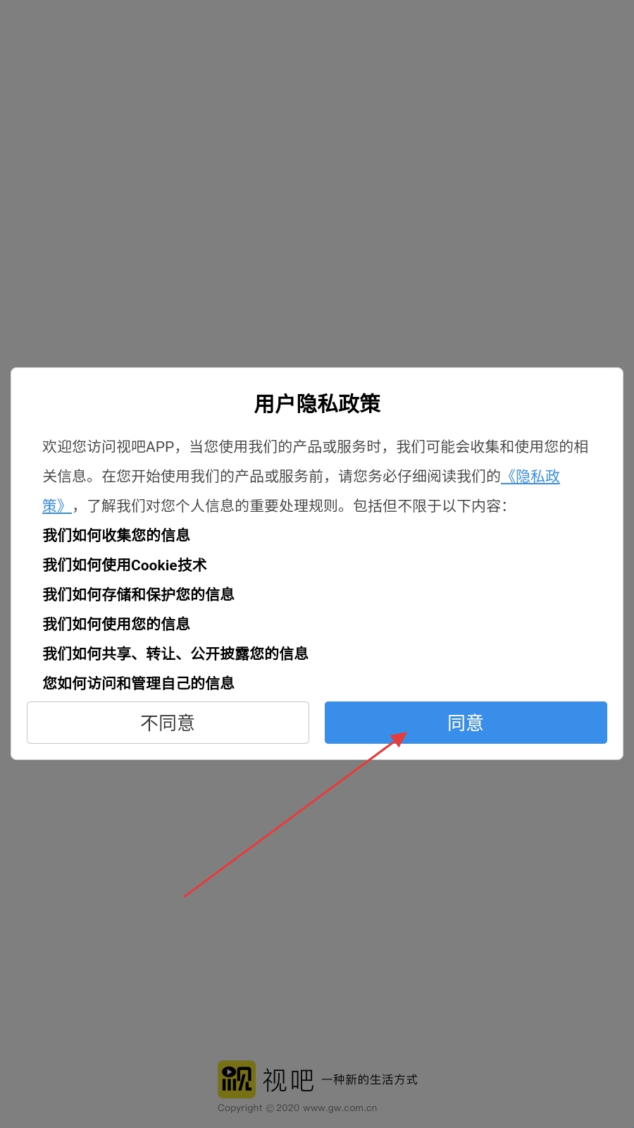 1、打开视吧APP,在【用户隐私政策】弹窗点击【同意】,才可继续使用。