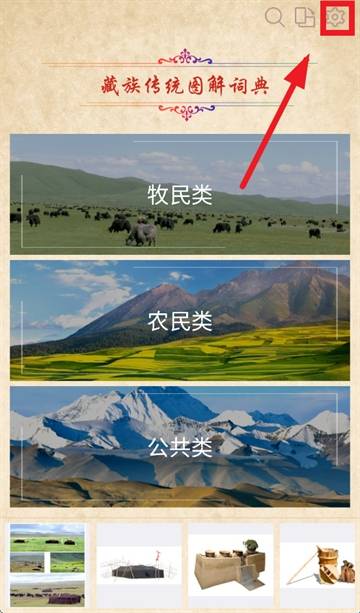 1、打开传统图解词典app,进入后点击右上角齿轮状设置按钮。