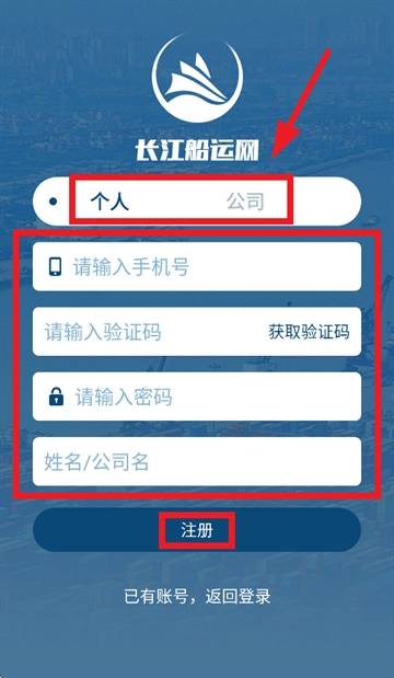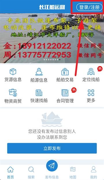 1、打开长江船运网app,进入首页后点击登录/注册。