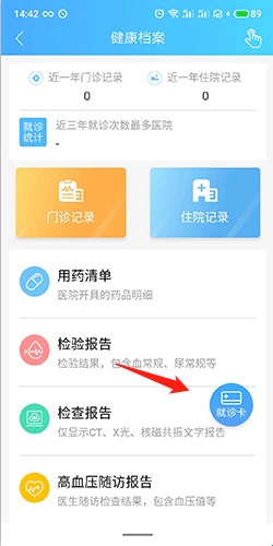 2、进入健康档案页面,点击右下角的“就诊卡”选项。