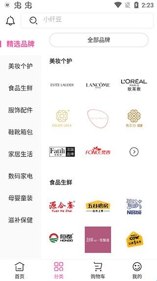 3、分类页面,精选品牌、美妆个户、食品生鲜、服饰配件、鞋靴箱包、家居生活、数码家电、母婴童装、滋补保健;
