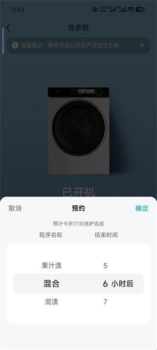 4.洗衣机:控制开机与预约:点击洗衣机图标开机→选择“预约”→选择洗涤程序即可。
