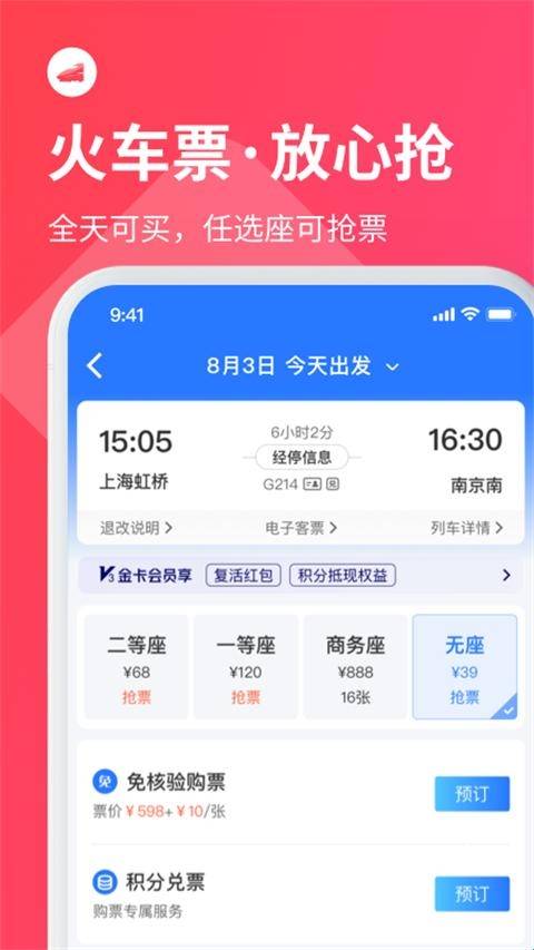 提供退改签及私人订制服务,体验更优秀,部分地区火车票支持电子票,无需邮寄,一键出票。