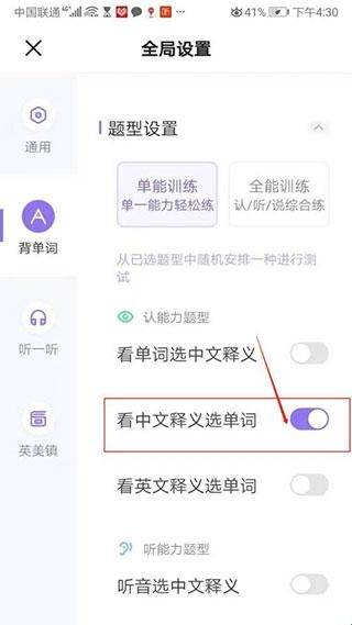 4、进入全局设置页面,点击背单词右边的题型设置。