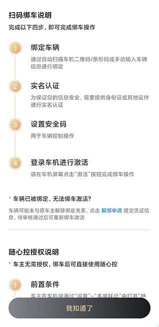 5.需要先绑定爱车才能使用,点击“爱车绑定”,按照步骤进行完成绑车操作,点击“我知道了”;