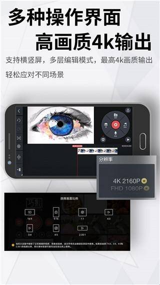 KineMaster是一款在安卓系统上运行的顶尖视频剪辑软件,研发团队历经几年的呕心沥血,以最科学的方法设计操作页面,请最专业的设计师精心设计各类主题模板、转场、水印等效果;不仅包含了剪切、添加背景音乐、滤镜等实用功能,而且还添加了多图层剪辑、色度键、音量包络线、手机端实时预览等超强剪辑功能使它远胜过PC端任何一款视频剪辑软件。对于专业还是业余视频剪辑爱好者,都可以通过KineMaster提供的功能无尽地畅想,如同给他们插上一双带有灵感的翅膀,让其在奇思妙想的海洋里自由地创作。