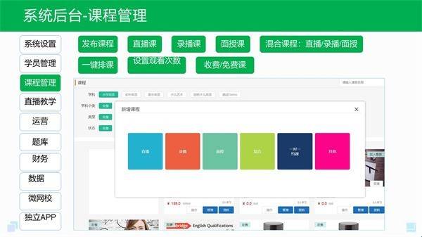 在后台管理系统中,您可以创建您想要提供的课程,并设置相关信息,例如课程名称、简介、封面、价格等,也可以选择合适的直播形式(视频、音频、PPT等)和班型(大班、小班等),并添加相关信息(文档、图片、音频等)。